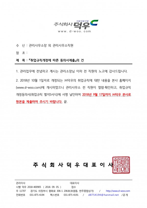 2018년 10월 1일 개정본 주식회사 덕우 취업규칙을 첨부하오니